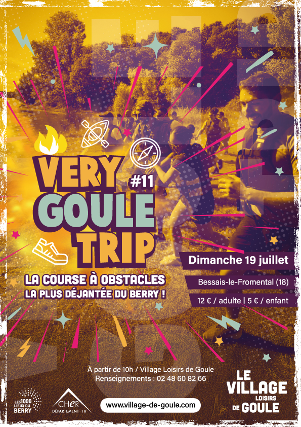 Participez à la course à obstacles la plus déjantée du Berry ! Seul, entre amis ou en famille, venez défier notre parcours composé d’épreuves terrestres et nautiques. Course à pied, kayak, franchissements d’obstacles etc., oserez-vous vous avancer sur la ligne de départ ?! Le Very Goule Trip est une course festive tout public (à partir de 8 ans), il est obligatoire de savoir nager pour participer.